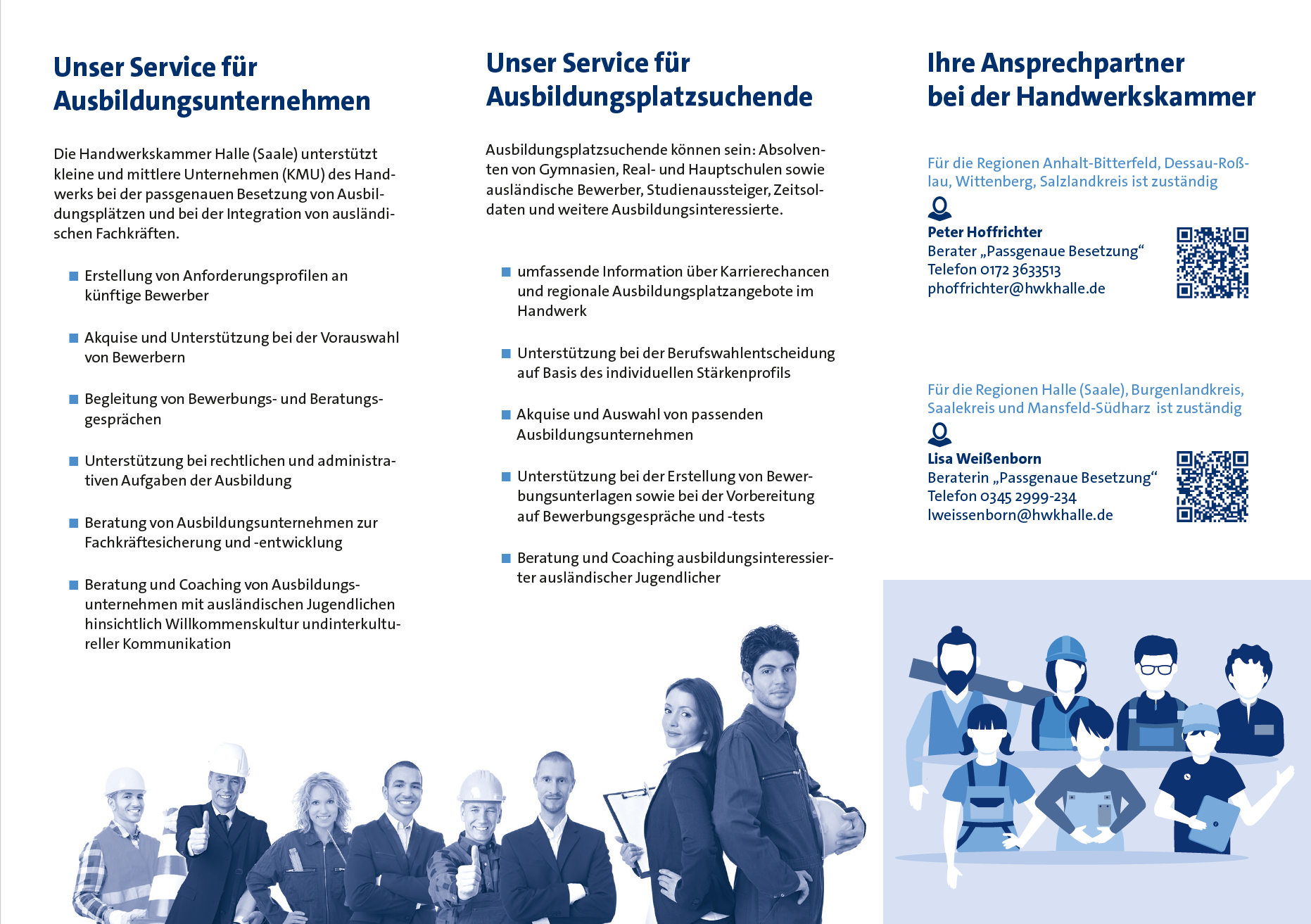 Die Handwerkskammer Halle ist zentraler Servicepartner und Interessenvertreter für Handwerksbetriebe sowie deren Mitarbeiter und Lehrlinge. Als zukunftsorientierter Interessenvertreter wirken wir aktiv unterstützend in allen Fragen unserer Mitgliedsbetriebe. Wir greifen aktuelle Anforderungen des Handwerks auf und setzen diese in konkrete Bildungs-, Beratungs-, Service- und Projektangebote um.